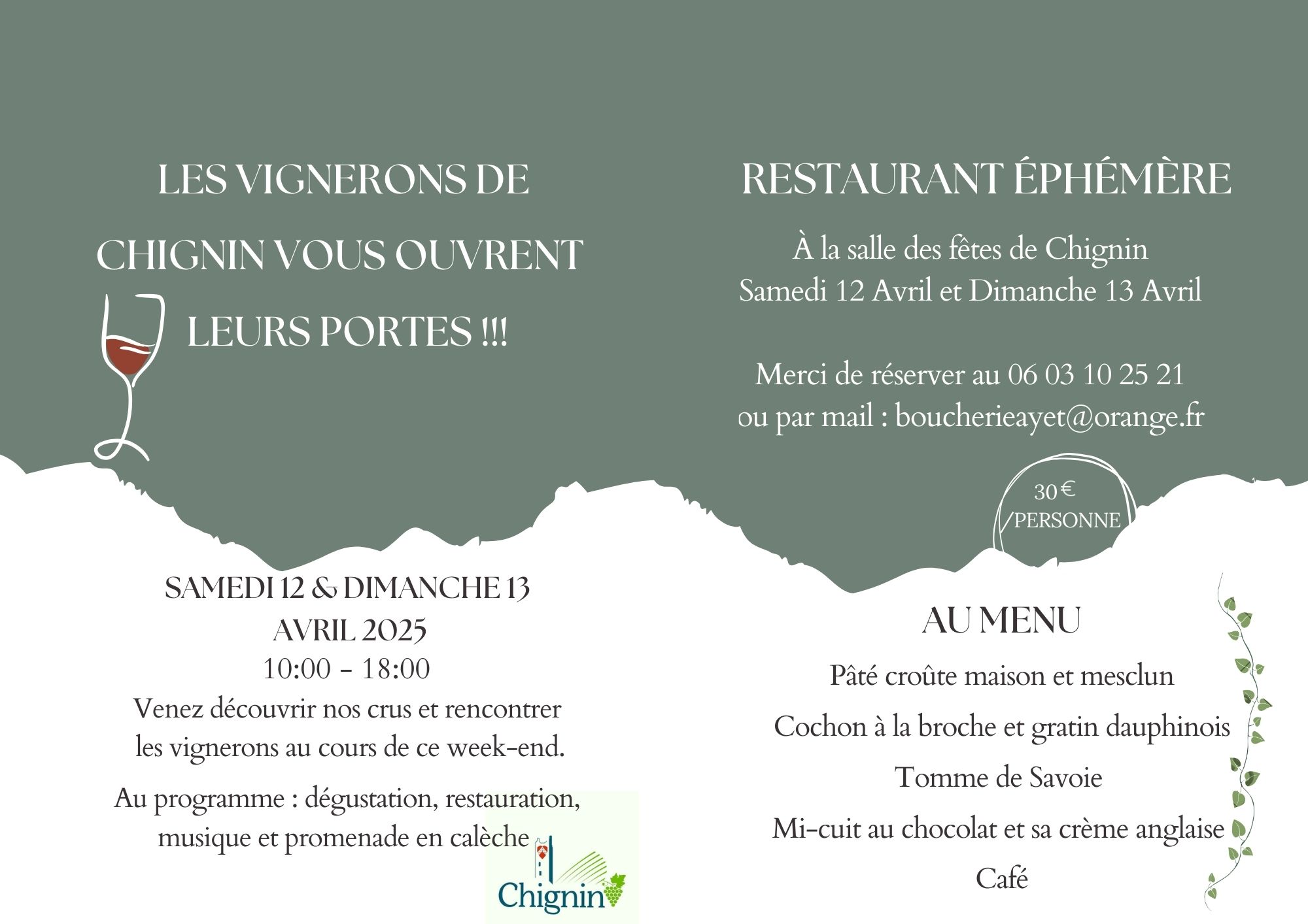 Il vous sera également possible de vous restaurer à midi à la salle des fêtes « le Clos Dénarié » de Chignin (30 € par personne), réservation conseillée au 06 03 10 25 21 ou par mail boucherieayet@orange.fr